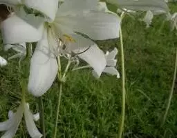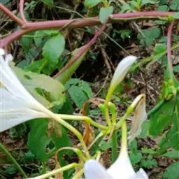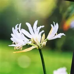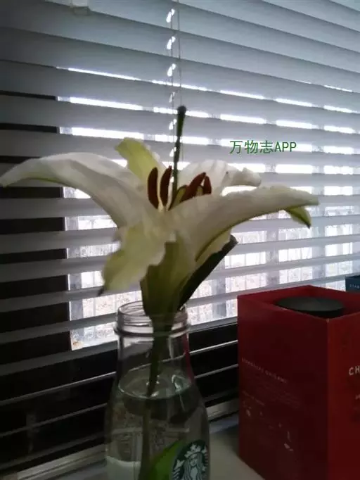花常一亭一朵,直径5~6cm,花被片白色,向后卷曲,6片副冠呈酒杯状,白色,基部黄色。