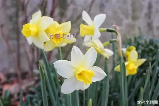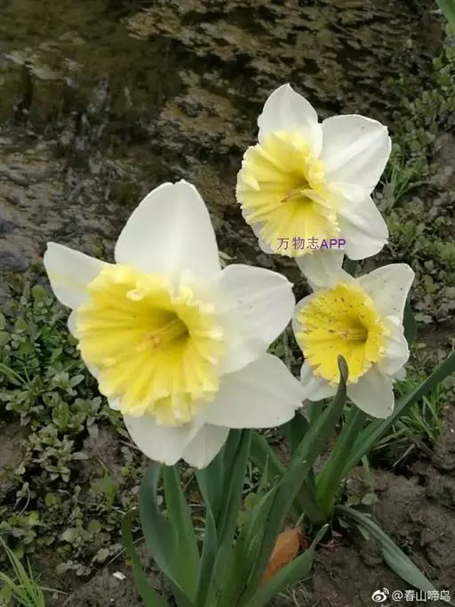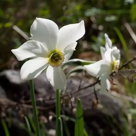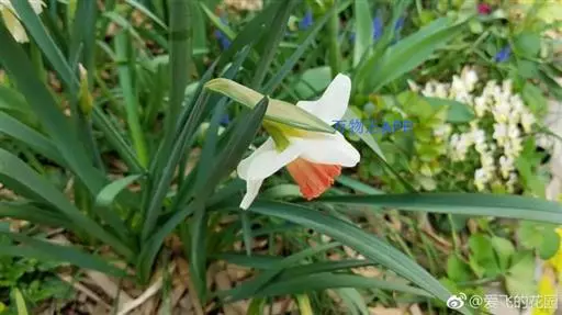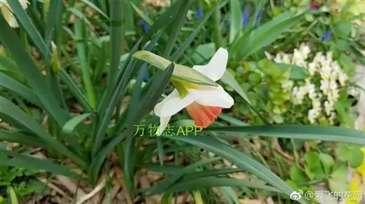 原产法国、希腊至地中海沿岸。鳞茎较小,叶宽线形,粉绿色。花茎花葶与叶等长或略高。顶生一花。花被片纯白,副花冠浅杯状,边缘红色,颇为娇艳,有芳香。花期4月。休眠期很短,宜早栽种。