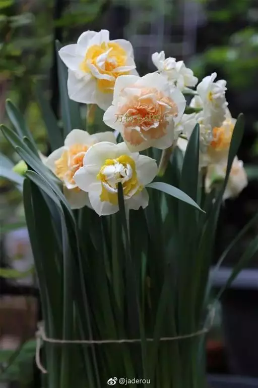 观赏价值极高的重瓣洋水仙,花瓣多为金黄色,内夹少量由花蕊突变而来的深红色花瓣。