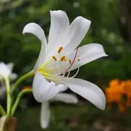 长筒石蒜草本,地生。鳞茎卵球形;叶披针形;伞形花序,有花5-7朵,花白色;花被裂片腹面稍有淡红色条纹,…