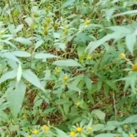 白花鬼针草 一年生直立草本,高30-100cm。茎钝四棱形,无毛或上部被极稀的柔毛。茎下部叶较小,3裂或不分裂,通常在开花前枯萎;中部叶具长1.5-5cm无翅的柄,三出;小叶常为3格,很少为具5(-7)小叶的羽状复叶,两侧小叶椭圆形或卵状椭圆形,长2-4.5cm,宽1.5-2.5cm,先端锐尖,基部近圆形或阔楔形,有时偏斜,不对称,边缘有锯齿,顶生小叶较磊,长椭圆形或卵状长圆形,长3.5-7cm,先端渐尖,基部渐狭或近圆形,具长1-2cm的柄,边缘锯齿,上部叶小,3裂或不分裂,条状披针形。