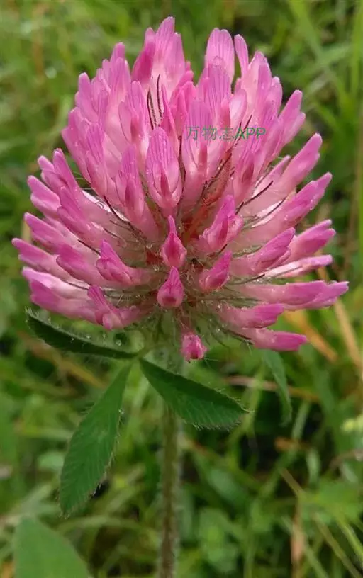 掌状三出复叶;托叶近卵形,膜质,每侧具脉纹8-9条,基部抱茎,先端离生部分渐尖,具锥 红车轴草的花和叶子 刺状尖头;叶柄较长,茎上部的叶柄短,被伸展毛或秃净;小叶卵状椭圆形至倒卵形,长1.5-3.5 (-5) cm,宽1-2cm,先端钝,有时微凹,基部阔楔形,两面疏生褐色长柔毛,叶面上常有V字形白斑,侧脉约15对,作20°角展开在叶边处分叉隆起,伸出形成不明显的钝齿;小叶柄短,长约1.5mm。