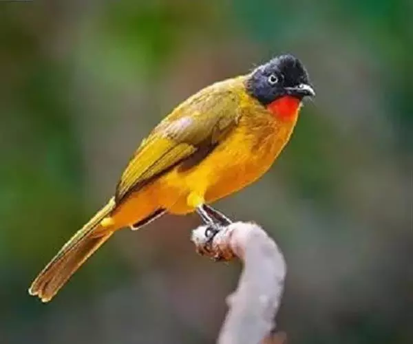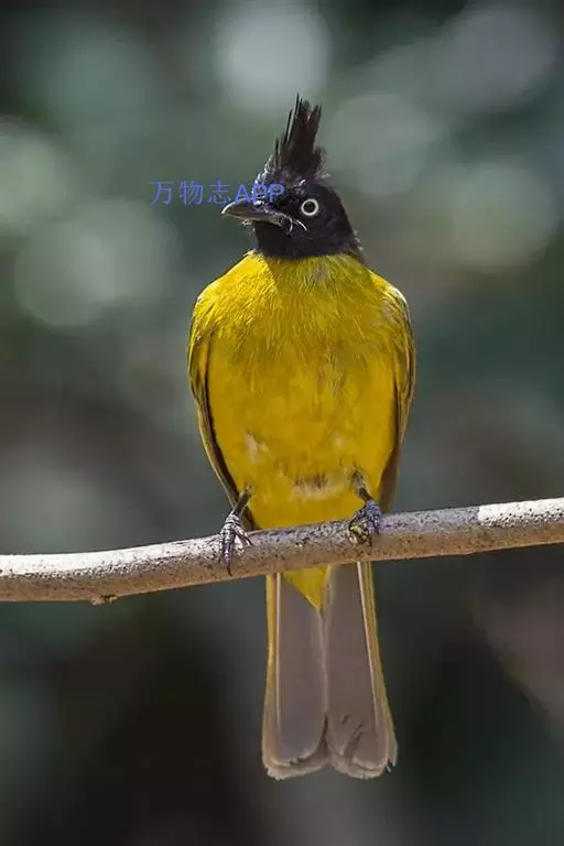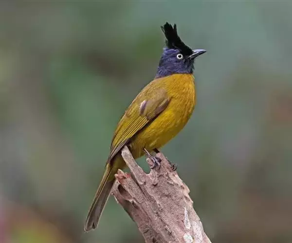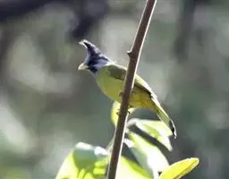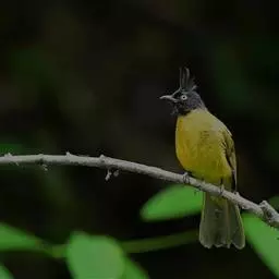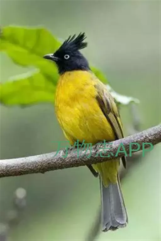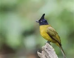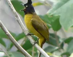 黑冠黄鹎(学名:Pycnonotus melanicterus):体长18-21厘米,是一种中等体型偏黄色鹎。整个头、颈、颏、喉黑色,头顶有显著直立的羽冠,黑色,上体褐橄榄黄绿色,下体橄榄黄色。虹膜偏红;嘴及脚黑色。