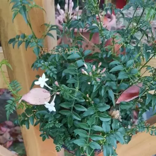 攀援灌木,高1-4米。小枝圆柱形,具棱或沟。叶对生,羽状深裂或具5-9小叶, 素馨花 叶长3-8厘米,宽3-6厘米;叶轴常具窄翼,叶柄长0.5-4厘米;小叶片卵形或长卵形,顶生小叶片常为窄菱形,长0.7-3.8厘米,宽0.5-1.5厘米,先端急尖、渐尖、钝或圆,有时具短尖头、基部楔形、钝或圆。