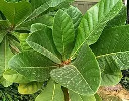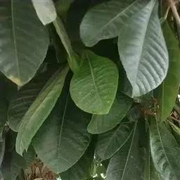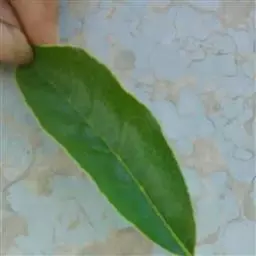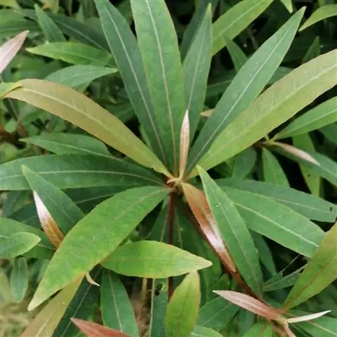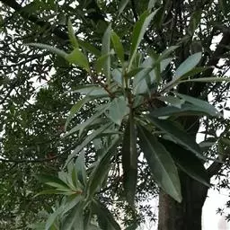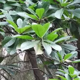 叶聚生于枝顶,革质,倒卵状披针形,长11-20厘米,宽5-7.5厘米,先端钝,偶有短小尖头,中部以下渐变狭窄,基部窄而钝,或为窄圆形,上面深绿色而发亮,干后淡绿色,下面初时有短柔毛,不久变秃净,仅在中脉上面有微毛,全缘,或上半部有小钝齿,侧脉12-14对,与网脉在上面明显,在下面突起;叶柄长1.5-3厘米,有微毛。