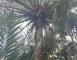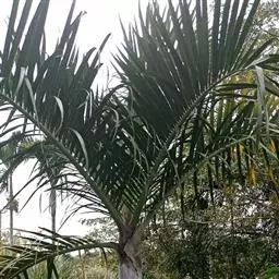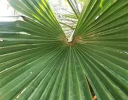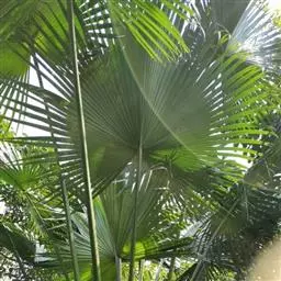 贝叶棕(学名:Corypha umbraculifera L.)是棕榈科,贝叶棕属植株高大粗壮乔木状植物,高可达25米,具较密的环状叶痕。叶片大,半月型,呈扇状深裂,裂片裂至中部,剑形,叶柄粗壮,上面有沟槽,边缘具短齿,花序顶生直立、圆锥形,序轴上由佛焰苞所包被,上面着生花;花两性,小,乳白色,有臭味。果实球形,种子近球形或卵球形,胚顶生。2-4月开花,翌年5-6月结果。