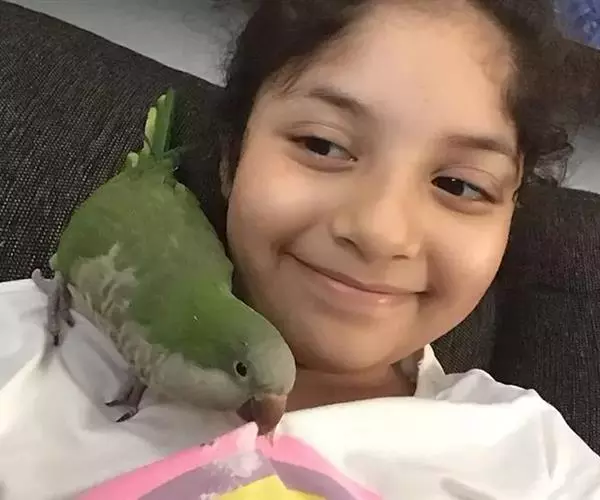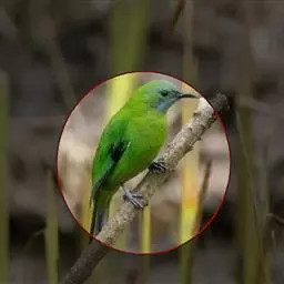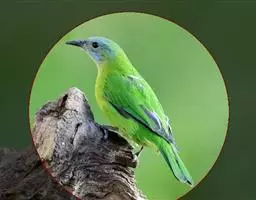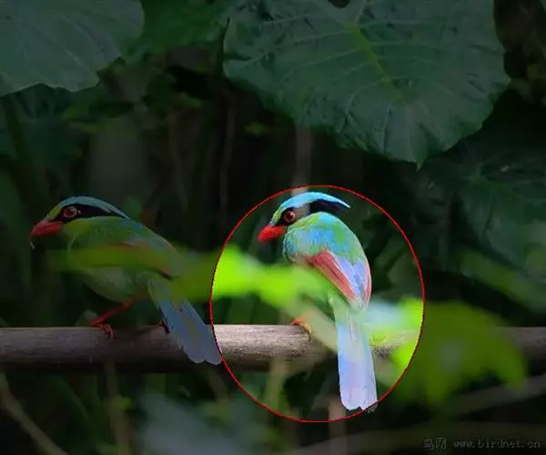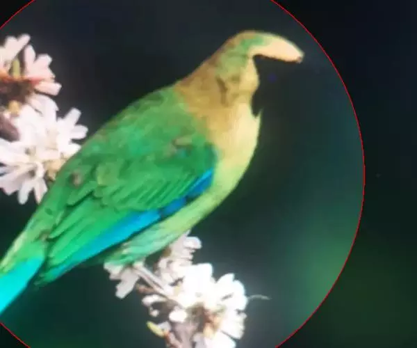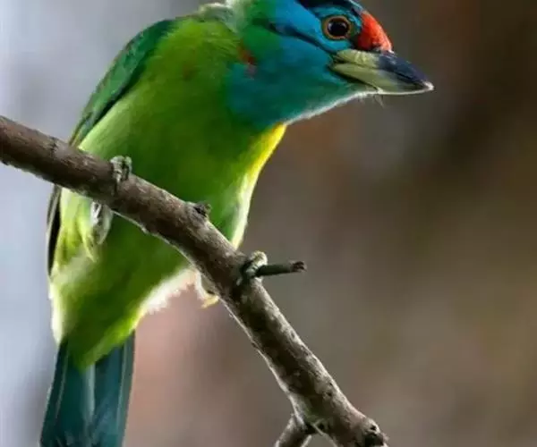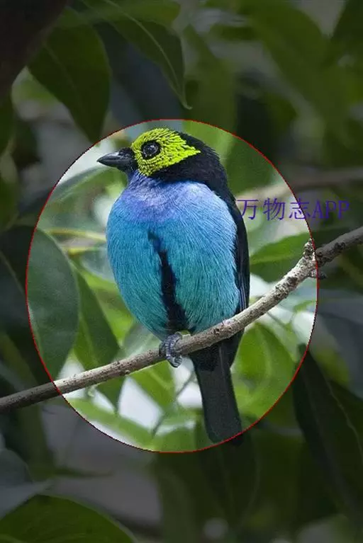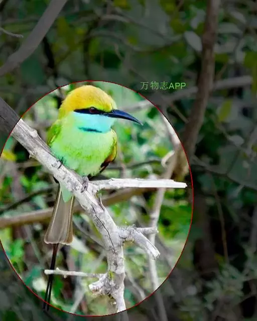 长20cm 嘴粗厚 ,黑色 ,脚铅灰色 。头部大致为蓝色 ,额 、喉黄色 ,眉斑杂有黑色羽毛 ,眼先有红色斑点 ,前颈亦有红斑 。后颈 、背部鲜绿色 , 胸以下鲜黄绿色 。