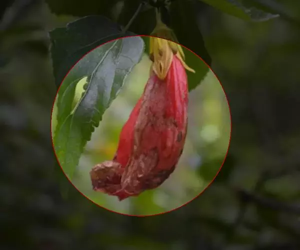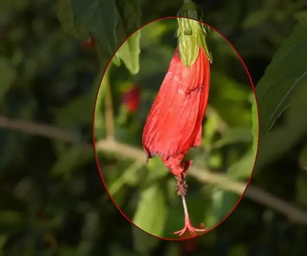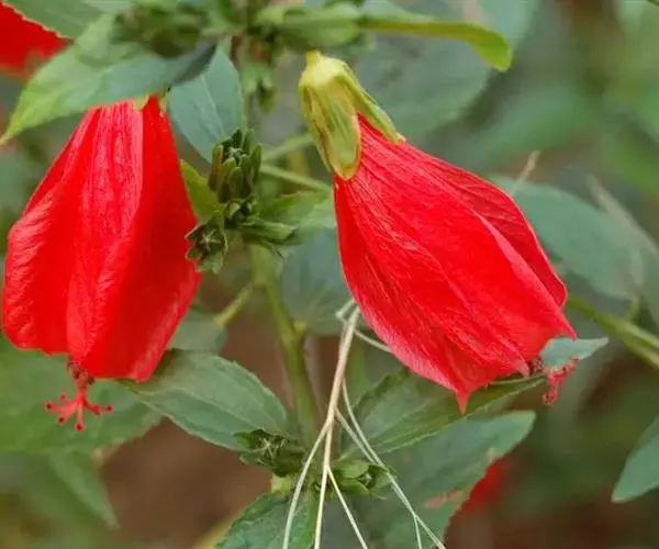 垂花悬铃花(学名:Malvaviscus penduliflorus Moc. & Sessé ex DC.)是锦葵科、悬铃花属常绿小灌木,外型略似朱槿,但叶片较为狭长浓绿;高30-60厘米,叶片互生,卵形或卵状矩圆形,单叶,有时浅裂,叶形变化较多,叶面具星状毛。花红色,花通常单生于上部叶腋处,下垂,花冠呈漏斗形,五枚花瓣略左旋作卷筒状,仅上部略微展开,雌雄蕊细长突出花瓣外,看似永远含苞待放。