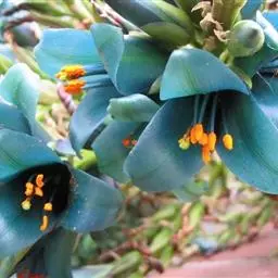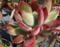 正常生长期叶片呈绿色,在光照充足、温差适宜的环境下叶片粉红至深红带紫;花茎自叶腋抽出,聚伞花序,小花橙红色,盛开在晚冬至春季。