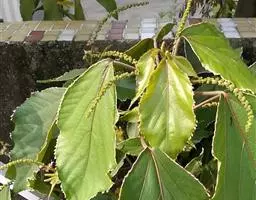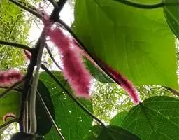 总状花序或圆锥花序,长15-30厘米或更长;苞片阔三角形,膜质,早落;雄花:花萼裂片卵状三角形,长7-10毫米;雄蕊束众多;雌花:萼片卵状披针形,长5-8毫米,凋落;子房卵状,直径约5毫米,密生软刺或无刺,花柱红色,长约4毫米,顶部2裂,密生乳头状突起。