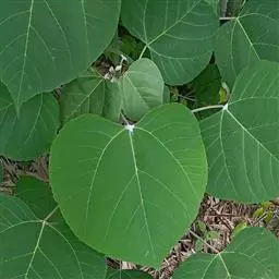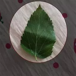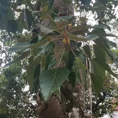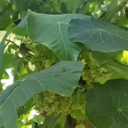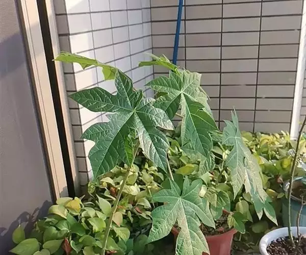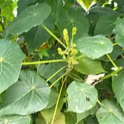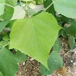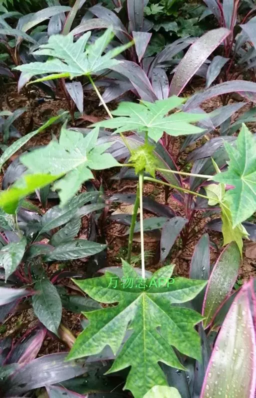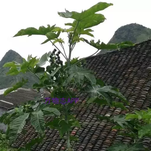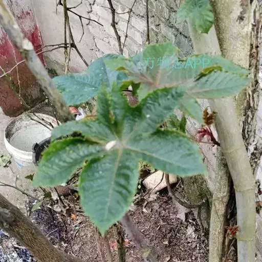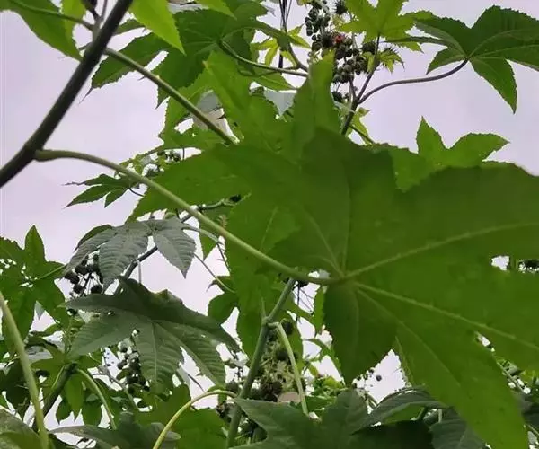 叶轮廓近圆形,长和宽达40厘米或更大,掌状7-11裂,裂缺几达中部,裂片卵状长圆形或披针形,顶端急尖或渐尖,边缘具锯齿。网脉明显;叶柄粗壮,中空,长可达40厘米,顶端具2枚盘状腺体,基部具盘状腺体;托叶长三角形,长2-3厘米,早落。