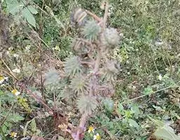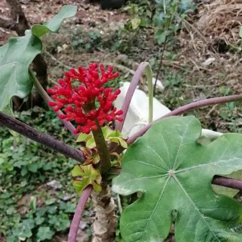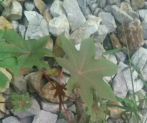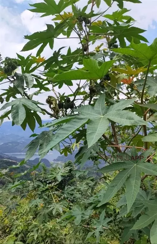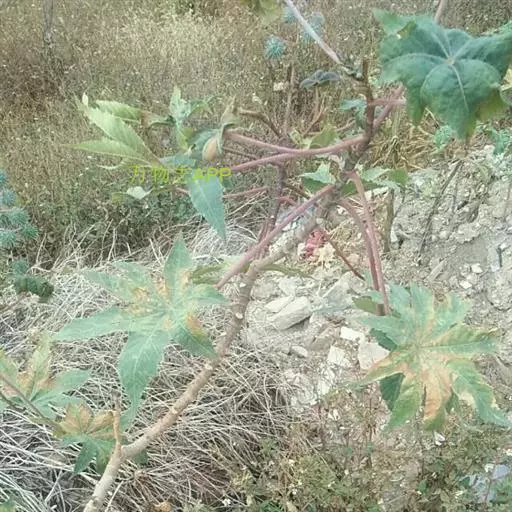 蓖麻(拉丁学名:Ricinus communis L.),为双子叶植物纲、大戟目、大戟科、蓖麻属一年生或多年生草本植物、热带或南方地区常成多年生灌木或小乔木。单叶互生,叶片盾状圆形。掌状分裂至叶片的一半以下,圆锥花序与叶对生及顶生,下部生雄花,上部生雌花;花瓣性同株,无花瓣;雄蕊多数,花丝多分枝;花柱,深红色。蒴果球形,有软刺,成熟时开裂。花期5-8月,果期7-10月。