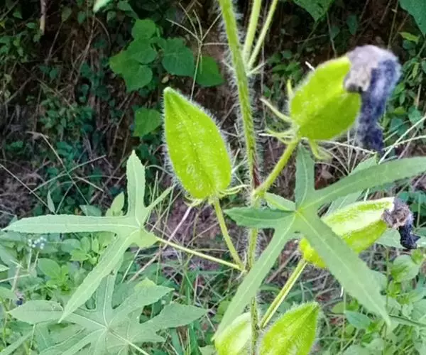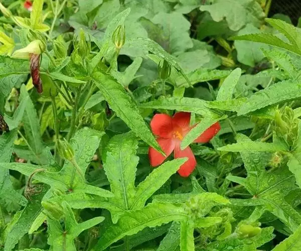 箭叶秋葵(Abelmoschus sagittifolius (Kurz) Merr.)又名五指山参、红花马宁等。锦葵科秋葵属。多年生草本,高40-100厘米,具萝卜状肉质根,小枝被糙硬长毛。蒴果椭圆形,4长约3厘米,直径约2厘米,被刺毛,具短喙;种子肾形,具腺状条纹。花期5-9月。