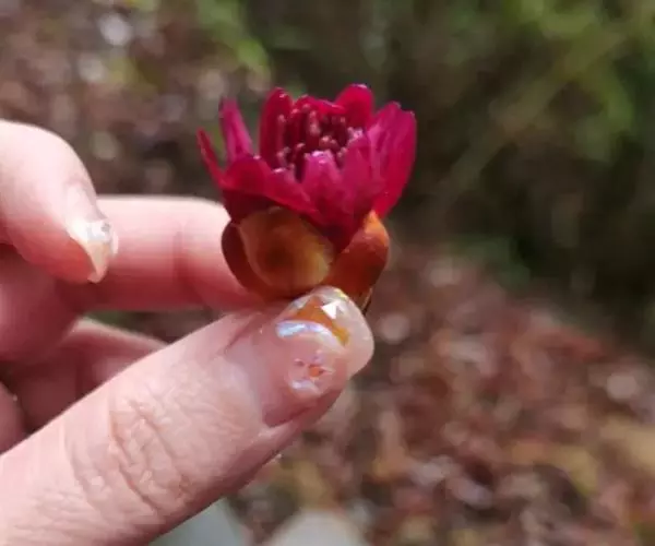 花单生于叶腋;直径1.5-2.5厘米;花梗长3-6厘米,有柔毛;萼片卵形,长4-6毫米,先端锐尖,外面有散生柔毛;副萼片倒卵形,长5-8毫米,比萼片长,先端常具3-5锯齿;花瓣倒卵形,长5-10毫米,黄色,先端圆钝;雄蕊20-30;心皮多数,离生;花托在果期膨大,海绵质,鲜红色,有光泽,直径10-20毫米,外面有长柔毛。