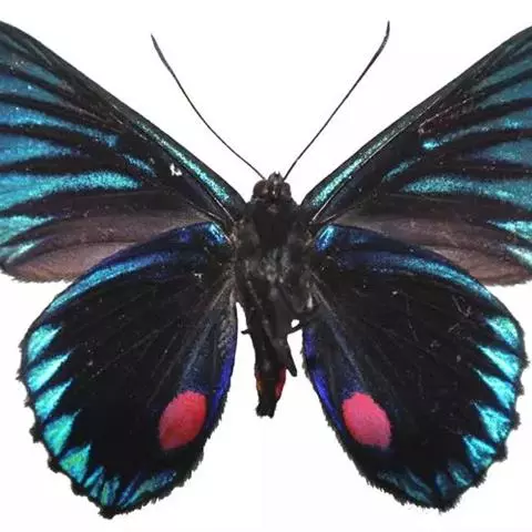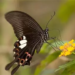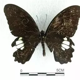 玉斑凤蝶Papilio helenus (Linnaeus, 1758)别名白纹凤蝶,是凤蝶科凤蝶属美凤蝶亚属大型种类。雌雄同型;体翅皆黑色,后翅正面中室外有3个并列的白色斑,亚外缘有1列模糊的新月形红色斑,有尾突1根;后翅反面亚外缘有1列醒目的新月形红斑,臀角处有圆形红色斑1-2个;雌蝶颜色浅褐色。