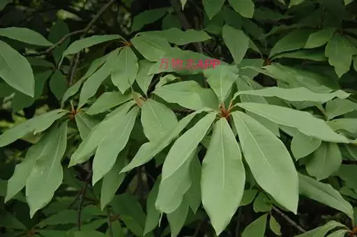 叶革质,常5-6片集生于枝端,倒卵形,先端短尖,2/3以下渐狭,基部楔形,长25-50cm,宽10-20cm,上面无毛,侧脉每边20-22条,网脉稀疏,干时两面均凸起;叶柄长2-3cm;托叶痕为叶柄长的1/3-2/3 。