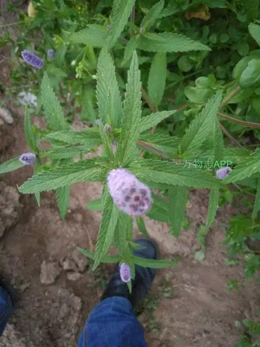 穗状花序长圆形或近圆形,长2-6厘米,宽1厘米,密被紫色串珠状长柔毛,由密集的轮伞花序组成;最下的一对苞叶与叶同形,向上呈苞片状,卵圆状圆形,长约1.5毫米,先端圆,外面及边缘被具节长柔毛。花萼钟状,长约1毫米,外面及边缘密被紫色串珠状长柔毛,萼齿5个,后3齿稍长,近三角形,果时花萼膨大,近球形,长4毫米,宽达3毫米,外面极密被串珠状紫色长柔毛。