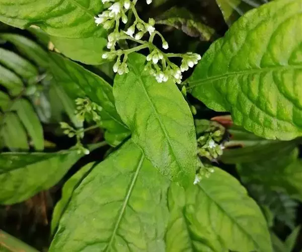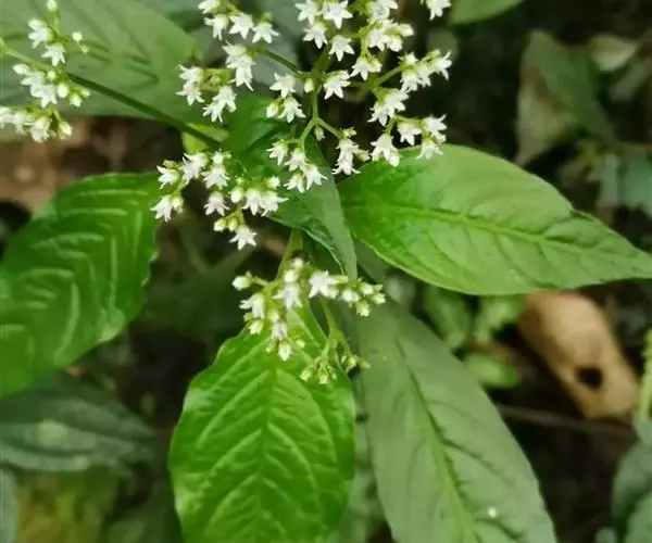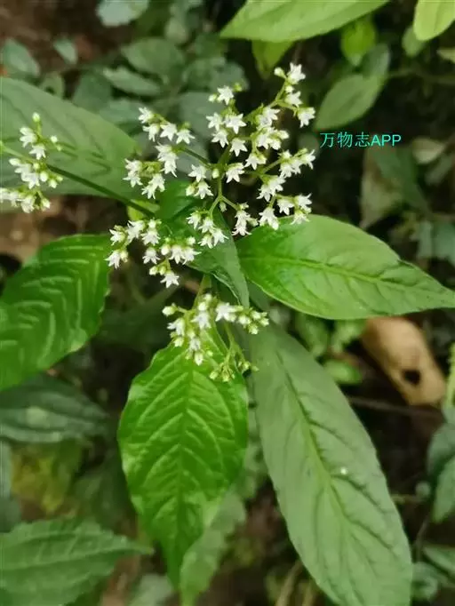 大叶度量草 多年生草本,高达60厘米。茎下部匍匐状;幼枝四棱形,老枝圆柱形;除幼叶下面、幼叶柄和花冠管喉部被短柔毛外,其余均无毛。叶片膜质至薄纸质,椭圆形、长椭圆形或披针形,有时倒披针形,长5-15厘米,宽2-5厘米,顶端渐尖至钝,基部楔形;侧脉每边8-10条;叶柄长1-2厘来;托叶退化或叶柄间成窄的叶鞘。三歧聚伞花序腋生或顶生,着花多朵;花序梗长3-7厘米;花梗长1-3毫米;苞片和小苞片披针形,长约1毫米;花萼5深裂,裂片卵状披针形,长约1毫米,宽0.5毫米,边缘膜质;花冠白色,坛状,花冠管长约1.5毫米,花冠裂片5,卵形,长约0.5毫米;雄蕊5,着生于花冠管近中部;子房近圆球形,光滑,花柱长0.5毫米,基部分离,柱头头状。蒴果近圆球状,直径2-2.5毫米,顶端有两尖角,基部有宿存花萼;种子圆球形,淡褐色,表面具小瘤状凸起。花期3-5月,果期6-7月。