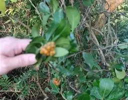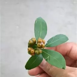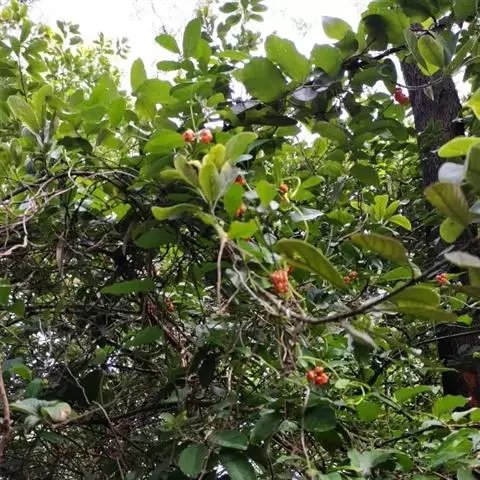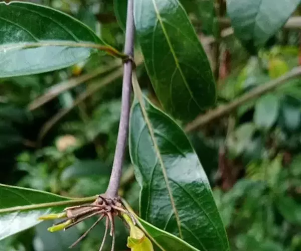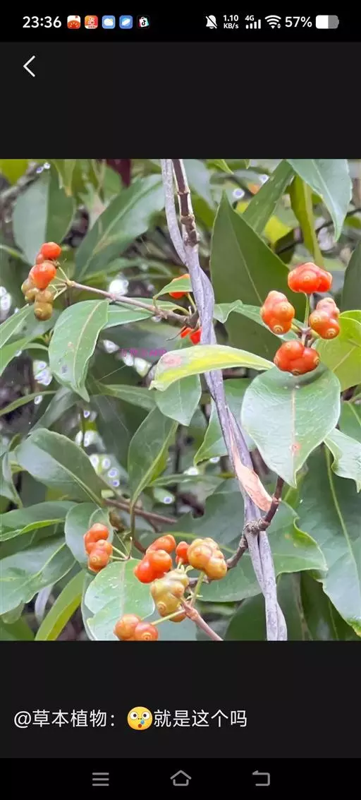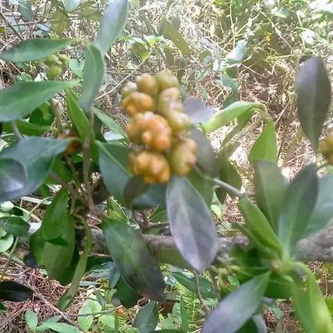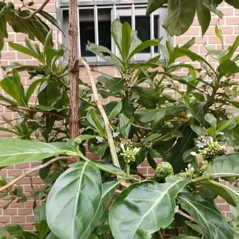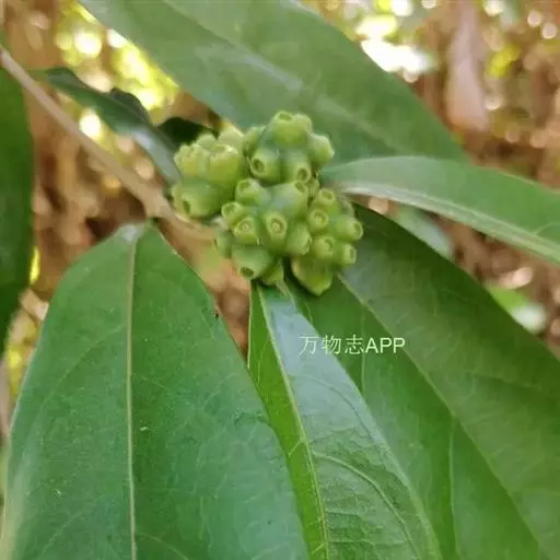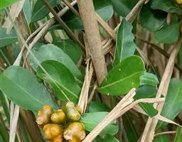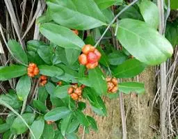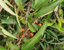 羊角藤,又名糠藤、乌苑藤。攀援灌木。无毛或幼枝稍被柔毛。叶薄革质,对生;叶柄长6-10mm;托叶膜质,长2-5mm;叶片形状各式,通常长圆状披针形,长5-8(-12)cm,宽1.5-3.5cm,先端急尖或短渐尖,基部楔形,侧脉5-7对。花序顶生,伞形花序式排列,通常由6个小头状花序组成,每个小头状花序直径6-8mm,有花6-12朵;总花梗长5-12mm;萼简半球形,长0.8-1mm,先端平截或不明显齿裂;花冠白色,4裂,几达基部,裂片狭长圆形,长3-3.2mm,先端稍钝而内弯;雄蕊4,聚合果扁球形或近肾形,直径8-12mm,熟时红色,有槽纹。花期5-7月,果期6-10月。