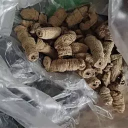 根多呈圆柱形,长短不等,直径0.8-2.0cm。根皮呈不规则片状、槽状或卷筒状。外表面灰褐色或灰棕色,具不规则皱纹或较粗的纵皱纹,具少数横缢纹,有的皮部断裂而露出粗糙木部,形成长短不等的节。质坚硬,柴性,易折断,断面呈颗粒状,皮部较薄,内表面浅灰紫色,木部粗而脆,直径0.5-1.4cm,约占直径60%-70%。无臭,味淡微甜。