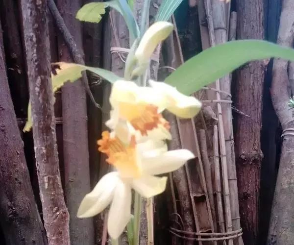 总状花序出自近茎端,常具1-2朵花;花序柄长5-10毫米,基部被3-4枚鞘;花苞片卵形,长4-5毫米,先端急尖;花梗和子房长约3厘米;子房黄绿色,三棱形;花开展,质地厚,具橘子香气;中萼片浅黄白色,卵状披针形,长约2.5厘米,宽9毫米,先端急尖,在背面中肋隆起呈翅状;侧萼片浅黄白色,斜卵状三角形,与中萼片近等大;萼囊淡黄色带橘红色,呈角状,长约2厘米,近先端处稍弯曲。