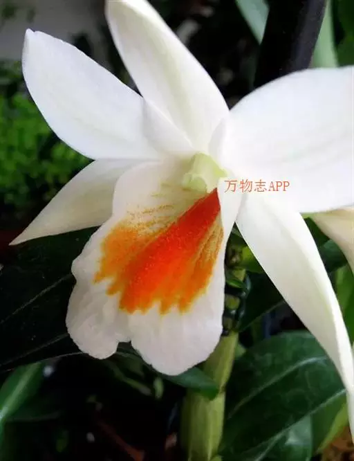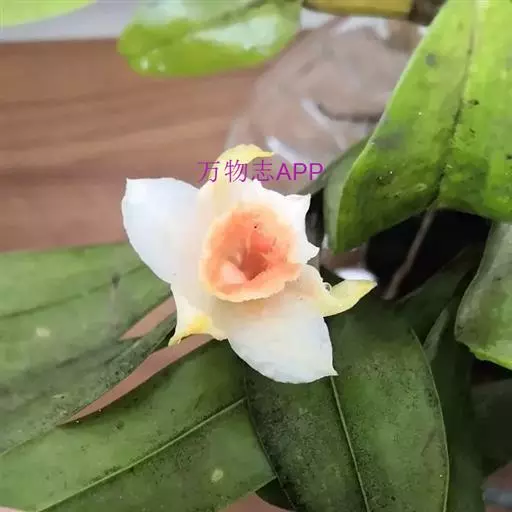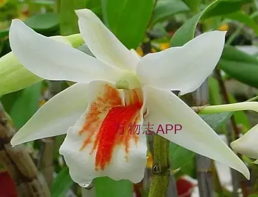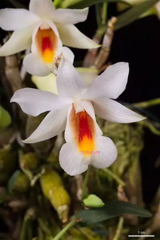 翅萼石斛(学名:Dendrobium cariniferum Rchb. f.):茎肉质状粗厚,圆柱形或有时膨大呈纺锤形,具6个以上的节。叶革质,数枚,二列,长圆形或舌状长圆形。总状花序出自近茎端,常具1-2朵花;花开展,质地厚,具橘子香气;花瓣白色,长圆状椭圆形,长约2厘米,宽1厘米,先端锐尖,具5条脉;唇瓣喇叭状,3裂。蒴果卵球形,粗达3厘米。花期3-4月。