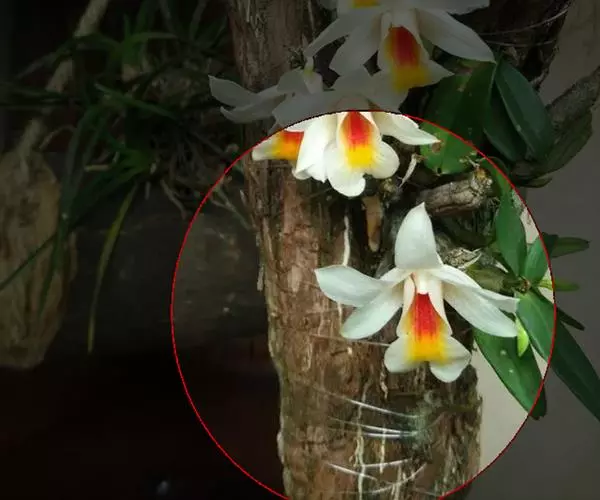 花瓣白色,长圆状椭圆形,长约2厘米,宽1厘米,先端锐尖,具5条脉;唇瓣喇叭状,3裂;侧裂片橘红色,围抱蕊柱,近倒卵形,前端边缘具细齿;中裂片黄色,近横长圆形,先端凹,前端边缘具不整齐的缺刻;唇盘橘红色,沿脉上密生粗短的流苏;蕊柱白色带橘红色,长约7毫米;药帽白色,半球形,前端边缘密生乳突状毛。