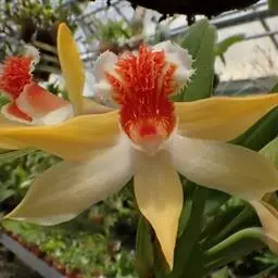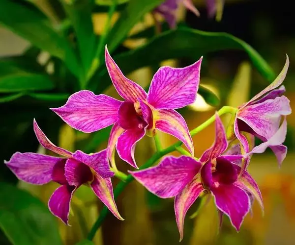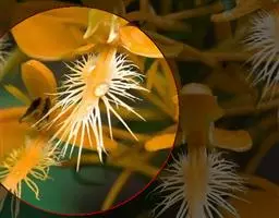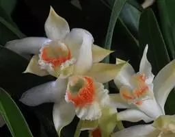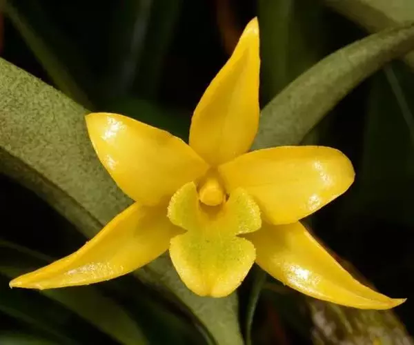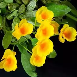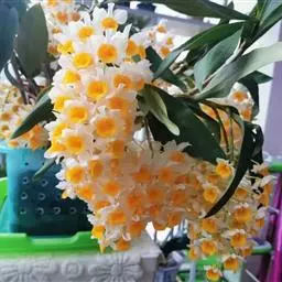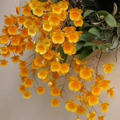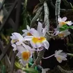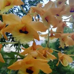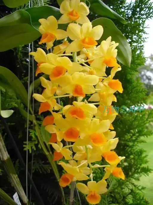 密花石斛(学名:Dendrobium densiflorum Lindl.):茎粗壮,通常棒状或纺锤形,下部常收狭为细圆柱形,不分枝,具数个节和4个纵棱;叶常3-4枚,近顶生,革质,长圆状披针形。总状花序从去年或2年生具叶的茎上端发出,下垂,密生许多花,花开展,萼片和花瓣淡黄色;花瓣近圆形,长1.5-2厘米,宽1.1-1.5厘米,基部收狭为短爪,中部以上边缘具啮齿,具3条主脉和许多支脉;唇瓣金黄色,圆状菱形。花期4-5月。