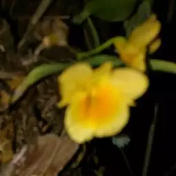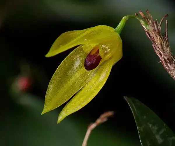 花瓣近圆形,长1.5-2厘米,宽1.1-1.5厘米,基部收狭为短爪,中部以上边缘具啮齿,具3条主脉和许多支脉;唇瓣金黄色,圆状菱形,长1.7-2.2厘米,宽达2.2厘米,先端圆形,基部具短爪,中部以下两侧围抱蕊柱,上面和下面的中部以上密被短绒毛;蕊柱桔黄色,长约4毫米;药帽橘黄色,前后压扁的半球形或圆锥形,前端边缘截形,并且具细缺刻。花期4-5月。