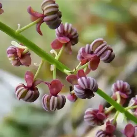小叶革质,卵状长圆形或卵形,长4厘米-7厘米,宽1.5厘米-3(5)厘米,先端狭圆,顶微凹入而具小凸尖,基部圆、阔楔形、截平或心形,边通常全缘;有时略具少数不规则的浅缺刻。总状花序长7厘米-9厘米,腋生或生于短枝上。雄花:萼片长2毫米-3毫米,紫色;雄蕊6,离生,长约2.5毫米,红色或紫红色,干后褐色或淡褐色。雌花:直径约2厘米;萼片长9毫米-12毫米,宽7毫米-10毫米,暗紫色;心皮5-7,紫色。果长圆形,长6厘米-8厘米厘米,直径3厘米-5厘米,熟时黄褐色;种子卵形,黑褐色。花期4月-5月,果期6月-9月。
