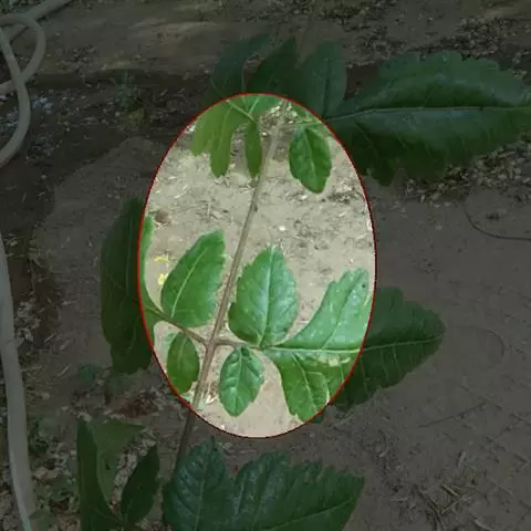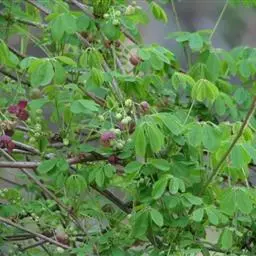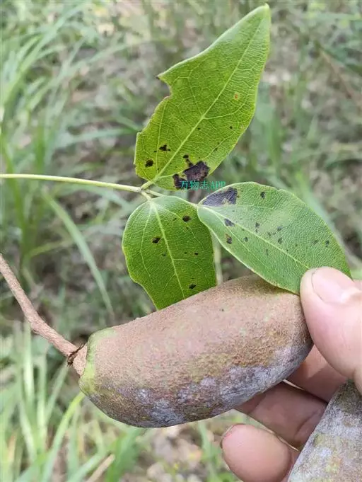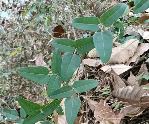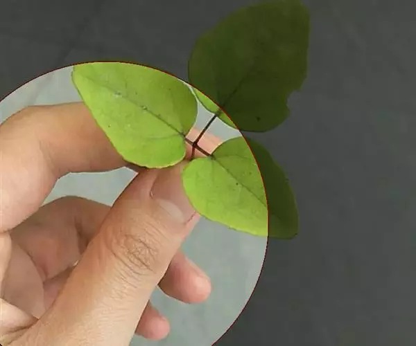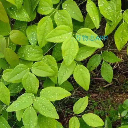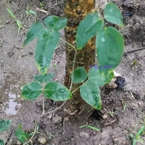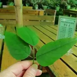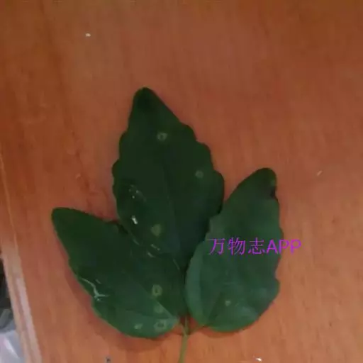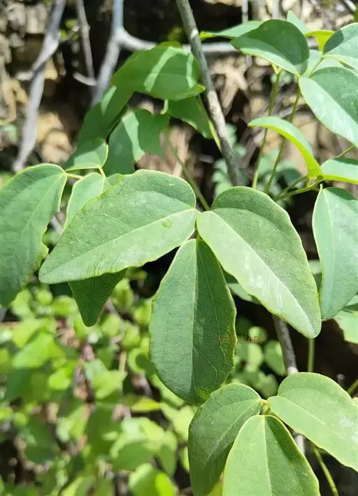 掌状复叶互生或在短枝上的簇生;叶柄直,长7-11厘米;小叶3片,纸质或薄革质,卵形至阔卵形,长4-7.5厘米,宽2-6厘米,先端通常钝或略凹入,具小凸尖,基部截平或圆形,边缘具波状齿或浅裂,上面深绿色,下面浅绿色;侧脉每边5-6条,与网脉同在两面略凸起;中央小叶柄长2-4厘米,侧生小叶柄长6-12毫米。