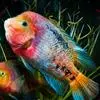 紫红火口鱼,大型慈鲷,厚侧扁形,口中位,口裂中等,大者可长达30厘米,额头稍隆起,喉部至胸部鲜红如火,因此而得“火口”之名。躯干前部金黄色,向后渐衍变为黄绿色至深紫色。血鹦鹉鱼的母本,金刚鹦鹉鱼的父本。