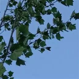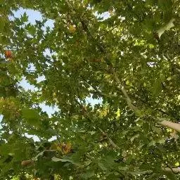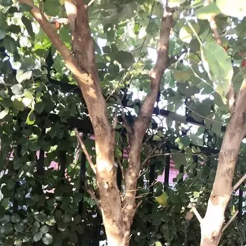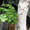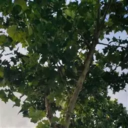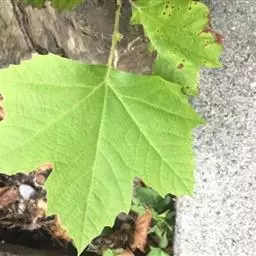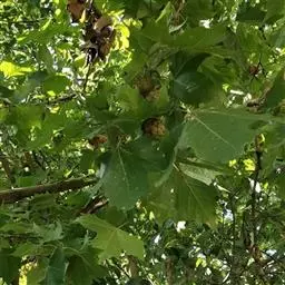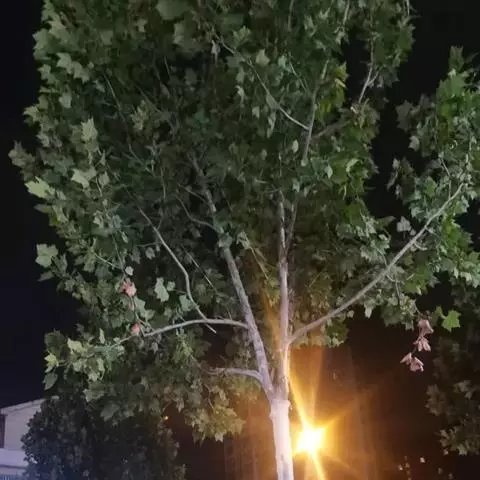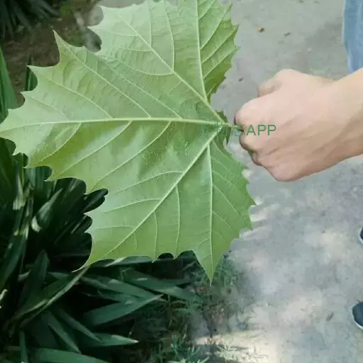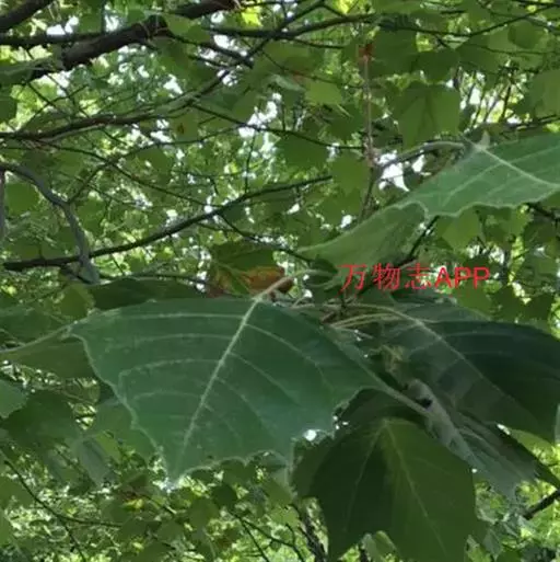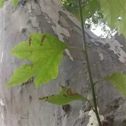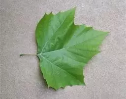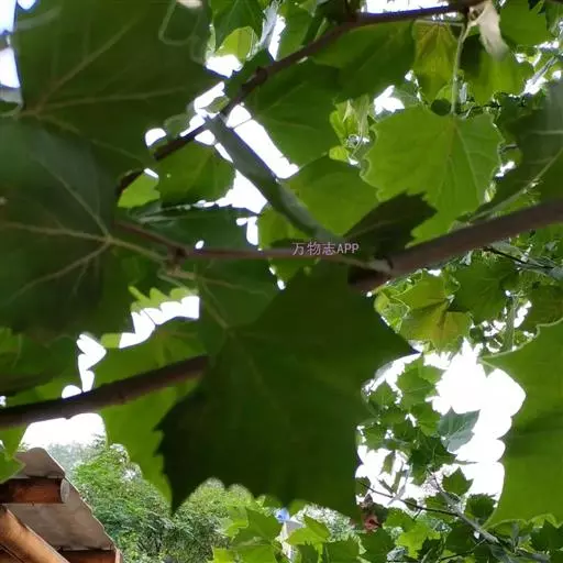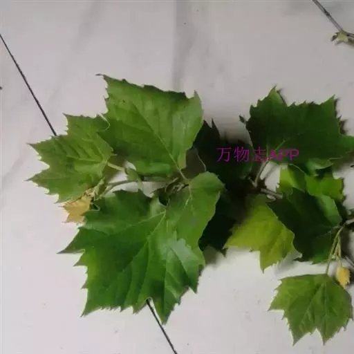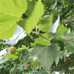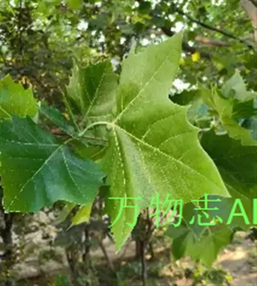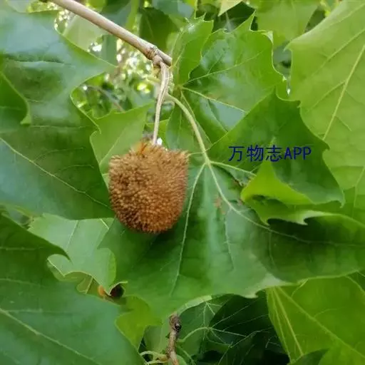 一球悬铃木 落叶大乔木,高40余米;树皮有浅沟,呈小块状剥落;嫩枝有黄褐色绒毛被。叶大、阔卵形,通常3浅裂,稀为5浅裂,宽10-22cm,长度比宽度略小;基部截形,阔心形,或稍呈楔形;裂片短三角形,宽度远较长度为大,边缘有数个粗大锯齿;上下两面初时被灰黄色绒毛,不久脱落,上面秃净,下面仅在脉上有毛,掌状脉3条,离基约1厘米;叶柄长4-7cm,密被绒毛;托叶较大,长约2-3cm,基部鞘状,上部扩大呈喇叭形,早落。
