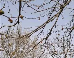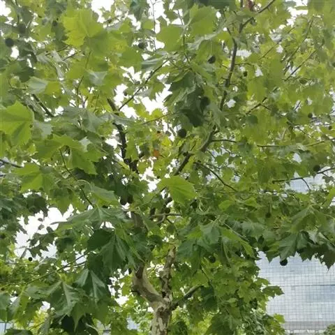 一球悬铃木(学名:Platanus occidentalis L.)是悬铃木科,悬铃木属落叶大乔木,高可达40米;树皮有浅沟,嫩枝有黄褐色绒毛被。叶片阔卵形,基部截形,阔心形,或稍呈楔形;裂片短三角形,边缘有数个粗大锯齿;掌状脉,叶柄密被绒毛;托叶较大,花单性,聚成圆球形头状花序。雄花花丝极短,花药伸长,雌花萼片短小;头状果序圆球形,单生;小坚果先端钝,基部的绒毛长为坚果之半。