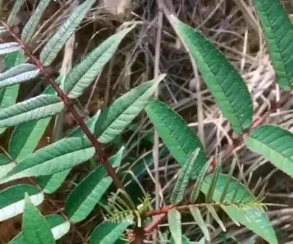 叶有小叶11-27片或稍多;小叶整齐对生,狭长披针形或位于叶轴基部的近卵形,长7-18cm,宽2-6cm,顶部渐狭长尖,基部圆,对称或一侧稍偏斜,叶缘有明显裂齿,油点多,肉眼可见,叶背灰绿色或有灰白色粉霜,中脉在叶面凹陷,侧脉每边11-16条。