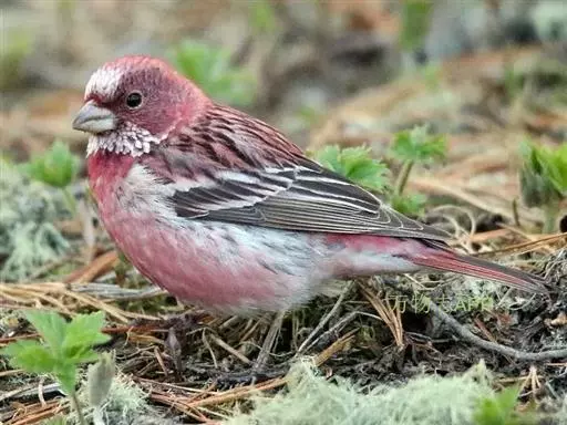 北朱雀(学名:Carpodacus roseus):雄鸟额前头及喉均银白色,具粉红色羽缘,呈鳞片状,头顶余部及后颈粉红,背灰褐而羽缘粉红,具较宽黑色羽干纹,腰和尾上覆粉红色,尾羽黑褐色,外羽片具粉红色边缘。飞羽黑褐色,具棕白沾粉红边缘;翅上覆羽具近白沾粉红的宽阔羽端,形成两道横斑。下体均呈粉红色,下腹近白;腋羽及尾下覆羽白,染粉红色。雌鸟头顶、头侧灰褐,羽缘粉红,各羽具黑褐色羽干纹,背灰褐,杂以粉红色,尾羽外羽片棕白色。下体棕白,杂以较明显粉红色,具黑褐色羽干纹,余者和雄鸟相似。虹膜:红色,嘴棕褐色,脚深灰褐色。