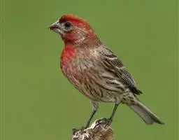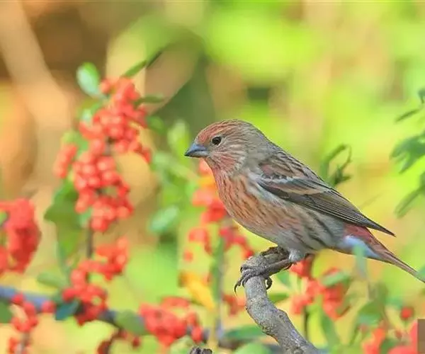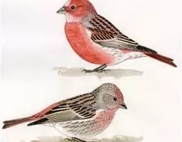 红腰朱雀:体长12-14厘米,小型鸟类。雄鸟前额和眉纹玫瑰粉红色,头顶和一宽的贯眼带深红褐色,背红…