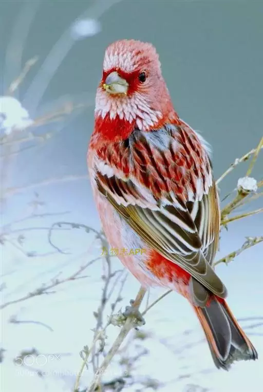 北朱雀,是燕雀科朱雀属鸟类。雄鸟额和头顶前部珠白色具窄的粉红色羽缘,…