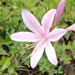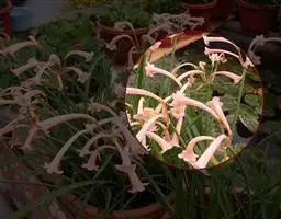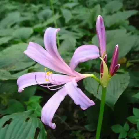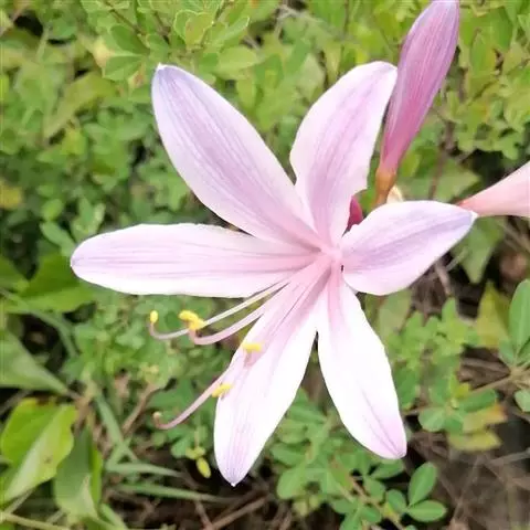 长筒石蒜草本,地生。鳞茎卵球形;叶披针形;伞形花序,有花5-7朵,花白色;花被裂片腹面稍有淡红色条纹,…