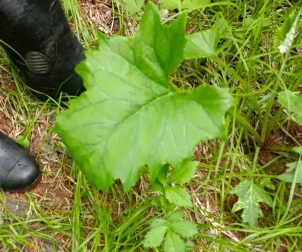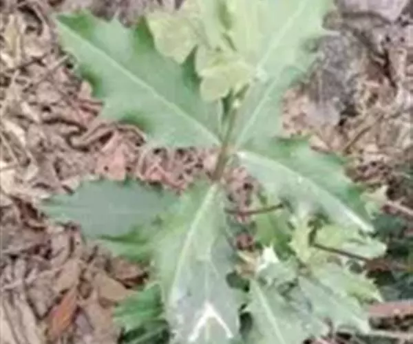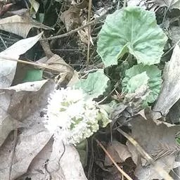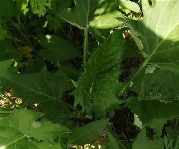 山牛蒡 多年生草本,高0.7-1.5米。根状茎粗。茎直立,单生,粗壮,基部直径达2厘米,上部分枝或不分枝,全部茎枝粗壮,有条棱,灰白色,被密厚绒毛或下部脱毛而至无毛。基部叶与下部茎叶有长叶柄,叶柄长达34厘米,有狭翼,叶片心形、卵形、宽卵形、卵状三角形或戟形,不分裂,长10-26厘米,宽12-20厘米,基部心形或戟形.或平截,边缘有三角形或斜三角.形粗大锯齿,但通常半裂或深裂,向上的叶渐小,卵形、椭圆形、披针形或长椭圆状披针形,边缘有锯齿或针刺,有短叶柄至无叶柄。全部叶两面异色,上面绿色,粗糙,有多细胞节毛,下面灰白色,被密厚的绒毛。
