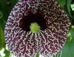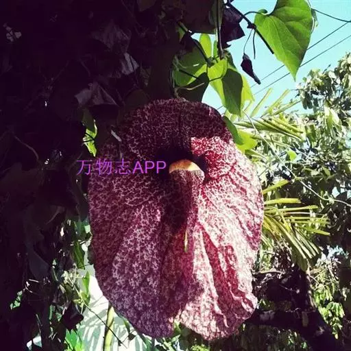 形态特征:大型木质藤本,茎粗糙,具棱。蔓可长达10米。叶互生,卵状心形,全缘,顶端尖,基部心形,具叶柄,着于老茎上,花大,紫褐色,具白色斑点。
