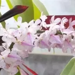 指甲兰是兰科指甲兰属植物。其茎粗壮;叶带状;总状花序疏生数朵花;萼片和花瓣淡白色,…