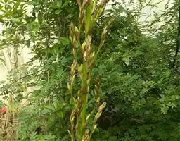 花葶高大而粗壮;花近白色,下垂,排成狭长的圆锥花序,花序轴有乳突状毛;花被片长约3-4厘米;花丝有疏柔毛;花柱长5-6毫米。秋季开花。