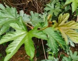 叶大,聚生于茎顶端,近盾形,直径可达60厘米,通常5-9深裂,每裂片再为羽状分裂;叶柄中空,长达60-100厘米。