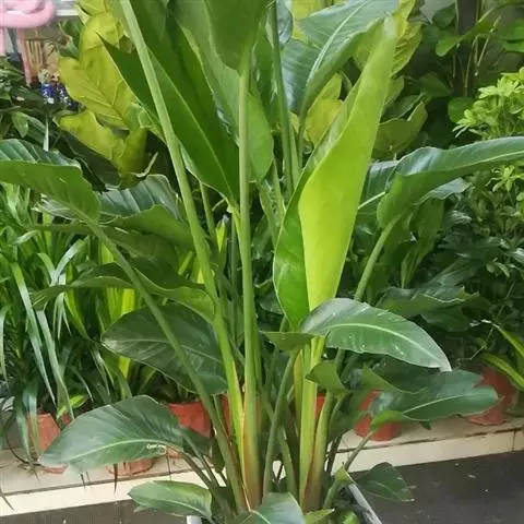 叶具鞘,长椭圆形,两端渐尖,叶长约50厘米,宽15-20厘米,有金黄色纵斑纹,十分艳丽。