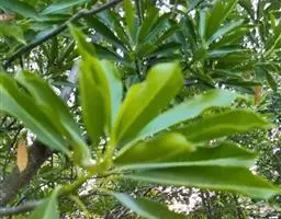 叶互生,近革质,无柄,线形或线状披针形,两端长尖,长10-15cm,宽5-12mm,表面有光泽,两面无毛,全缘,边稍背卷;中脉在叶面下陷,在叶背凸起,侧脉两面不明显。