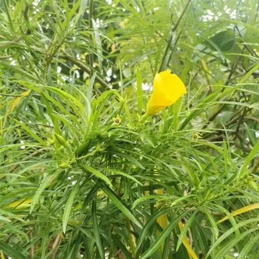 黄花夹竹桃(学名:Thevetia peruviana (Pers.)K. Schum.),又名“酒杯花”“柳木子”“黄花状元竹”,是夹竹桃科,黄花夹竹桃属下的常绿乔木植物。高达5m,全株无毛,树皮棕褐色;叶互生,近革质,线形或线状披针形;花大,黄色,具香味,顶生聚伞花序;核果扁三角状球形;花期5-12月。