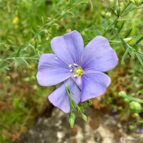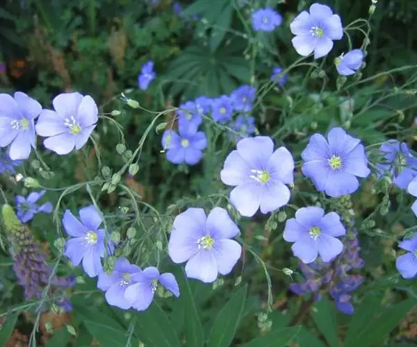 花单生于枝顶或枝的上部叶腋,组成疏散的聚伞花序;花直径15-20毫米;花梗长1-3厘米,直立;萼片5,卵形或卵状披针形,长约5-8毫米,先端凸尖或长尖,有3(5)脉;中央一脉明显凸起,边缘膜质,无腺点,全缘,有时上部有锯齿,宿存;花瓣5,倒卵形,长8-12毫米,蓝色或紫蓝色,稀白色或红色,先端啮蚀状;雄蕊5枚,花丝基部合生;退化雄蕊5枚,钻状;子房5室,花柱5枚,分离,柱头比花柱微粗,细线状或棒状,长于或几等于雄蕊。