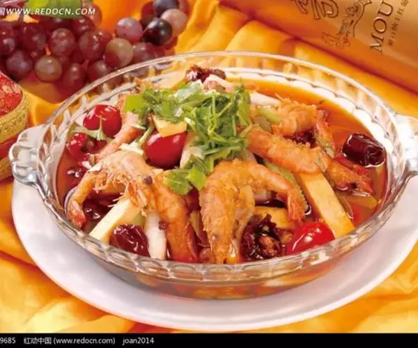 香锅虾是一道美食,制作原料主要有新鲜海虾、藕、洋葱。