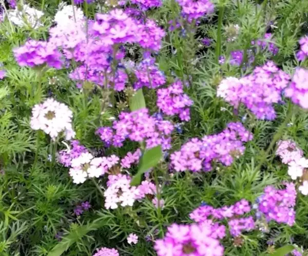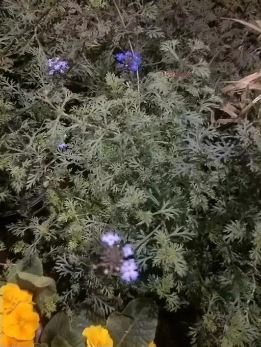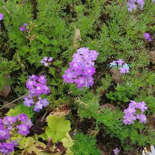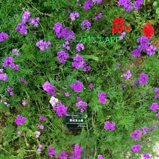 细叶美女樱(Verbena tenera Spreng.):也称羽叶马鞭草,马鞭草科马鞭草属一种多年生草本花卉,也可作一二年生栽培,原产于巴西、秘鲁和乌拉圭等美洲热带地区。